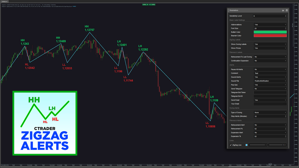 This is the cTrader ZigZag Alerts, it plots and alerts you about swing types (Higher High, Higher Low, Lower Low, etc.) and it also calculates and alerts about Fibonacci retracements and expansions comparing one swing with another. With its unique standardized approach, the ZigZag line remains consistent across all symbols, timeframes, and price ranges, ensuring accuracy and reliability in every market scenario.